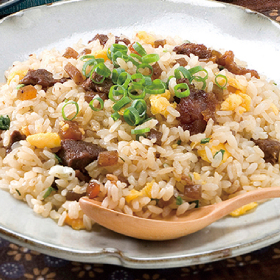神戸長田の庶民の味「ぼっかけ」(牛すじとコンニャクを甘辛く煮込んだもの)を炒飯にアレンジしました。