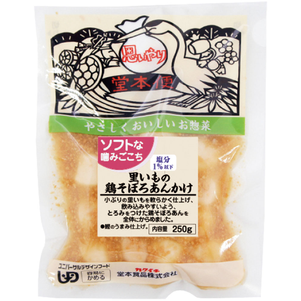 思いやり堂本便ソフトな噛みごこちシリーズ。小ぶりの里いもを軟らかく仕上げ、とろみをつけたそぼろあんをからめました。