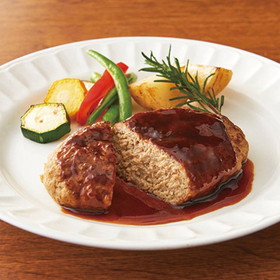 ハンバーグ本来の美味しさを追求し、植物性たん白不使用、肉は牛肉・豚肉のみを使用し真空パックをしています。肉の塩練時間にこだわり、高温で表面を一気に焼き上げ、蒸し焼きすることで、ふっくらジューシーなハンバーグに仕上げました。焼きたてのハンバーグのような香ばしさも特徴的です。※ソースは付いておりません。