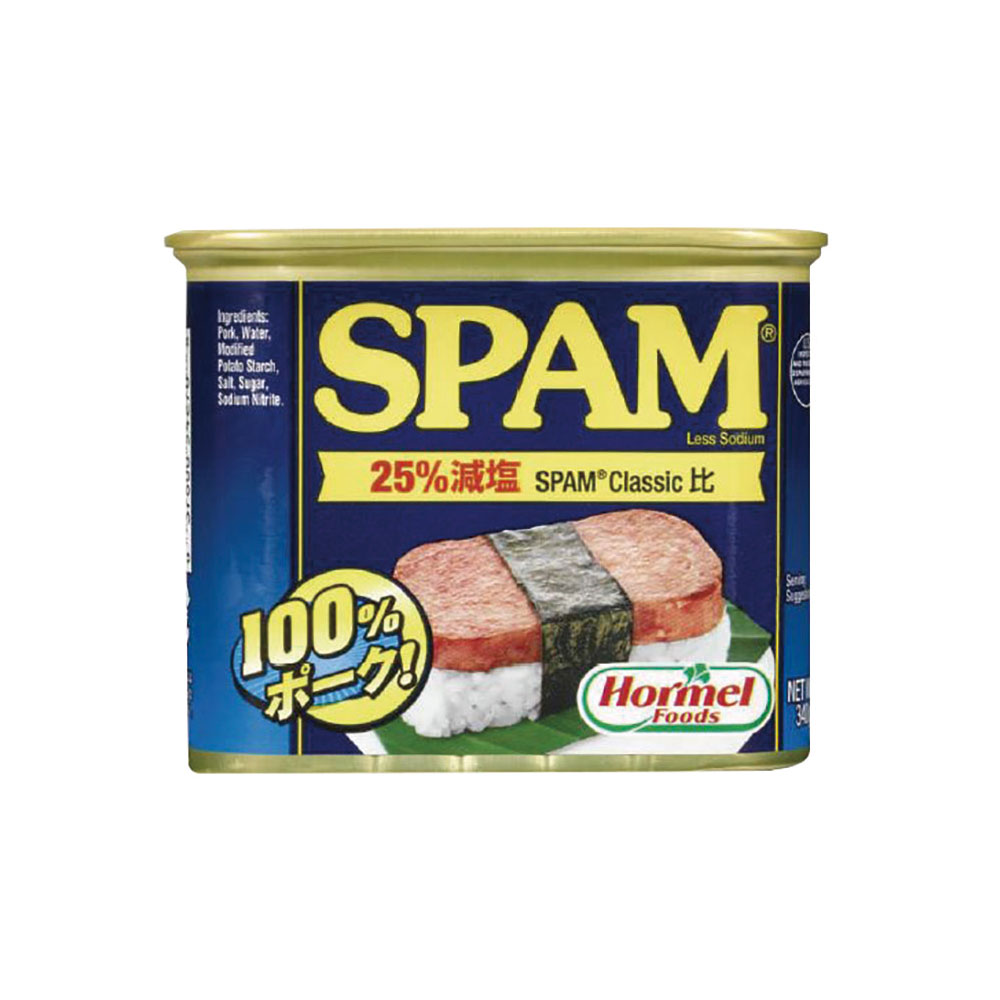 最もオーソドックスなスパムの減塩タイプです。ハム、ソーセージの料理用途を一つで備えるため、幅広い料理に使えます。密閉充填後、加圧加熱殺菌しているので、チルド加工品に比べて添加物が少ないのが特徴です。保存料不使用。