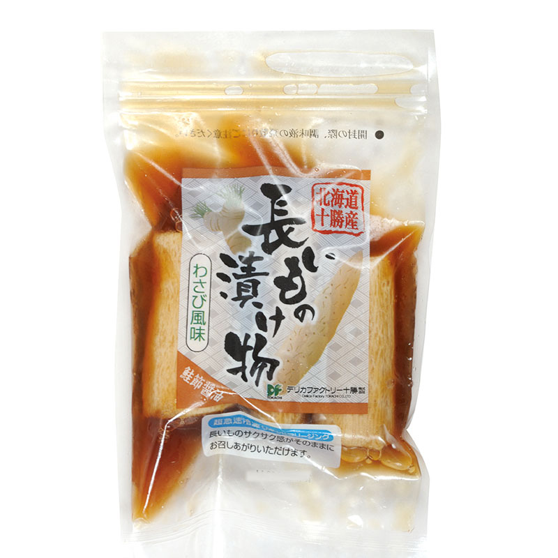 十勝産の長芋の漬物です。長芋特有の歯ごたえと、わさびの香りが食欲をそそります。瞬間凍結(リキッドフリージング)により、サクサク感そのままに冷凍することができました。