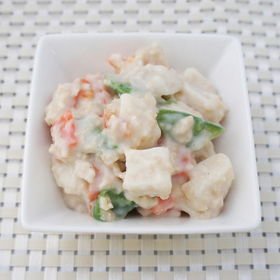 大豆で作った自家製「大豆クリーム」仕立ての洋惣菜です。鶏そぼろのうまみが活きています。絹さやを加え彩りよく仕上げました。