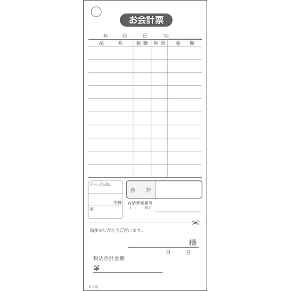 業務用食材 TOP ≫ 卓上用品 ≫ 伝票・用紙 ≫ 会計票 単式 領収証付 ミシン入 S-02 1包(10冊入) Y008530