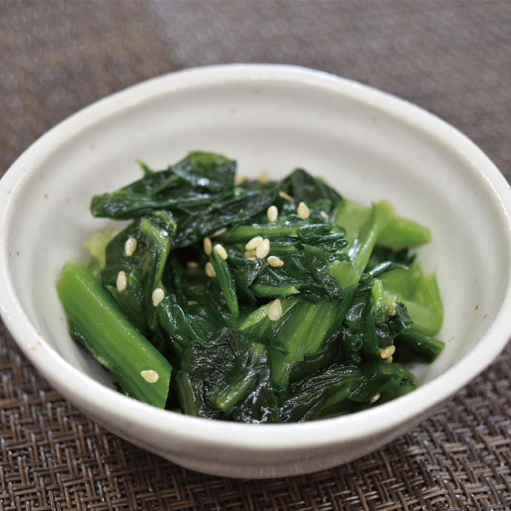 ■原材料:小松菜、砂糖、ごま油、醤油、食塩、こしょう、ごま/ 調味料(アミノ酸等)、(一部に小麦・ごま・大豆を含 む)