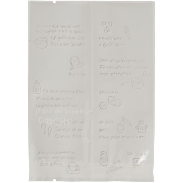 【規格内容】幅100×長さ150mm【形状】平袋(背貼り)【材質】バリアOP/DL/LLDPE【加工】Vノッチ(上下)【補足1】脱酸素剤対応、乾燥剤対応【補足2】使い捨て【色】透明白【柄】柄付【キーワード】英字柄、マチ無し、焼き菓子用袋、ラッピング、パッケージ、個包装用袋、包材、クッキー、マドレーヌ、フィナンシェ、マカロン、ガスバリア、脱酸素剤対応袋、焼き菓子袋、乾燥剤対応袋、クッキー袋【商品特徴】おもて面にフランス語、うら面には手書きのイラストが入ったデザインのガス袋。