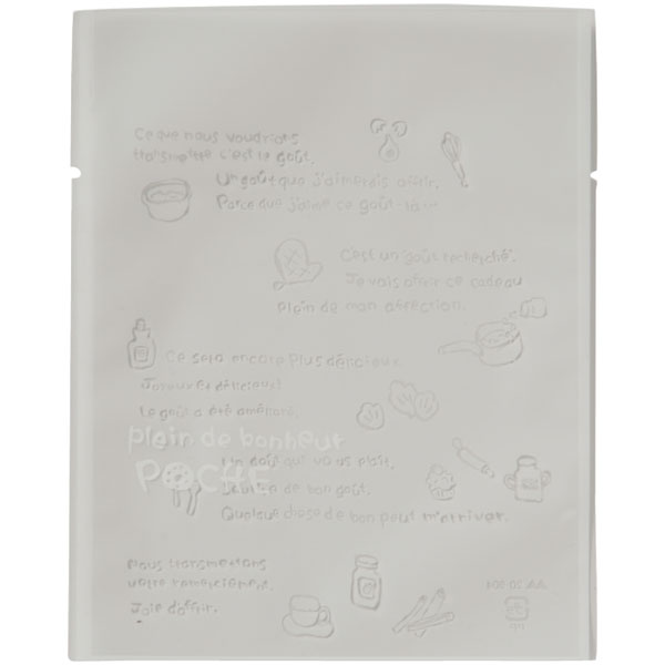 【規格内容】幅130×長さ160mm【形状】平袋(二方貼り)【材質】バリアOP/DL/LLDPE【加工】Uノッチ(左右)【補足1】脱酸素剤対応、乾燥剤対応【補足2】使い捨て【色】透明白【柄】柄付【キーワード】英字柄、マチ無し、焼き菓子用袋、ラッピング、パッケージ、個包装用袋、包材、クッキー、マドレーヌ、フィナンシェ、マカロン、ガスバリア、脱酸素剤対応袋、焼き菓子袋、乾燥剤対応袋、クッキー袋【商品特徴】おもて面にフランス語、うら面には手書きのイラストが入ったデザインのガス袋。