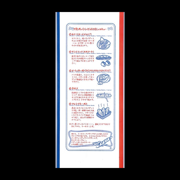 【規格内容】仕上幅115(マチ70)×長さ545+ベロ18mm【材質】晒60g、窓OPP【補足2】使い捨て【色】白赤青【柄】柄付【キーワード】窓付きバタール袋、窓付きフランスパン袋、窓付きバケット袋、パン屋さん向け、ベーカリー、見せるラッピング、ガゼット袋【商品特徴】焼きたてパンにはやっぱり紙包装!!中身が見えるから安心。裏面にはフランスパンをおいしく召し上がるための調理方法が載っています。