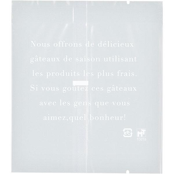 【規格内容】幅105×長さ120mm【厚み】0.06mm【形状】平袋(背貼り・底開きタイプ)【材質】透明蒸着PET/LLDPE【加工】Uノッチ(上下)【補足1】脱酸素剤対応、乾燥剤対応【補足2】使い捨て【色】透明白【柄】柄付【キーワード】英字柄、マチ無し、焼き菓子用袋、ラッピング、パッケージ、個包装用袋、包材、クッキー、マドレーヌ、フィナンシェ、マカロン、ガスバリア、脱酸素剤対応袋、焼き菓子袋、乾燥剤対応袋、クッキー袋【商品特徴】フランス語でおしゃれ。脱酸素剤対応の袋。フランス語が書かれています。 ※脱酸素剤、乾燥剤に対応しています。商品を下から入れるタイプになります。