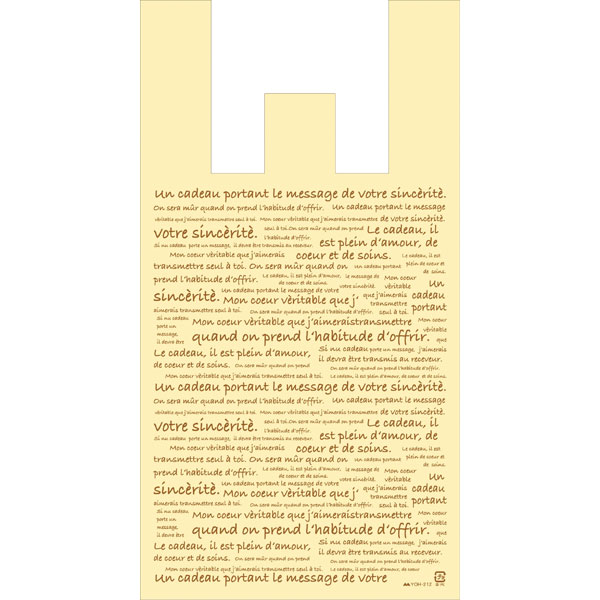 【規格内容】仕上幅300(マチ140)×長さ540mm【厚み】0.02mm【形状】レジ袋【材質】HDPE【補足2】使い捨て【色】透明茶【柄】柄付【キーワード】買い物袋、買物袋、レジ袋、手提げポリ袋、英字柄、洋菓子店向け、パン屋さん向け、ベーカリー、雑貨店向け【商品特徴】フランス語がデザインされたレジ袋。エンボス加工された素材です。 ※無くなり次第廃盤となります。