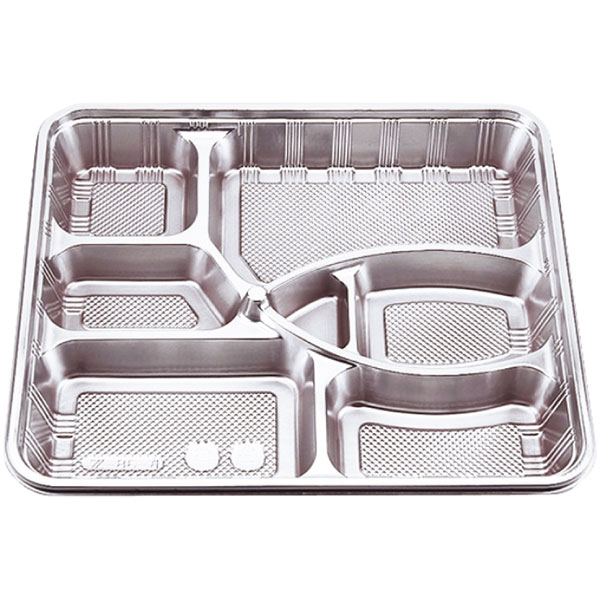【規格内容】本体:幅315×奥行285×高さ40mm、蓋:幅317×奥行287×高さ11mm※蓋はセット時の高さ(全高−本体高さ)【耐冷耐熱温度】本体:95℃、蓋:85℃【販売形態】本体・蓋セット【形状】のせ蓋【材質】本体:BFO、蓋:OPS【補足2】使い捨て【色】銀/透明【柄】柄付【区画数】07【商品特徴】弁当・会席からオードブルまで使用できる仕出し容器です。集いの席を美しく彩るロースタッキング(積み重ね)容器。
