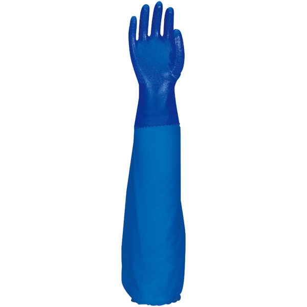 【規格内容】長さ60cm【材質】本体:ニトリル(合成ゴム)、腕カバー部分:PE(ポリエチレン)系樹脂【補足1】食品衛生法適合、抗菌・防臭仕様【補足2】再利用【色】青【柄】柄無【キーワード】ディスポノン手袋、厨房、工場【商品特徴】肘の上までしっかりカバー!全長60cmの腕カバー付ロング手袋。腕カバー部分は、軽量なポリエチレン系樹脂。接合部分は当社独自技術(特許登録済)により強力に接着。隙間から水が入る事がありません。裏布に、カビ・雑菌など悪臭の原因を抑える抗菌・防臭加工。食品衛生法適合品。