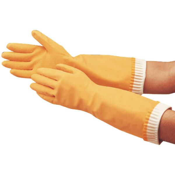 【規格内容】長さ42cm【厚み】0.45mm【材質】天然ゴム【補足1】食品衛生法適合、抗菌仕様【補足2】再利用【色】橙【柄】柄無【キーワード】ディスポノン手袋、厨房、工場【商品特徴】丈夫でやわらか、肘までカバーのロング厚手タイプ。内面裏毛加工で脱ぎはめ簡単、ソフトなはめ心地。菌の繁殖を抑える抗菌加工。ひっかきや引き裂き、熱にも強く、優れた耐久性を発揮します。環境にやさしい天然ゴムを使用。土中の微生物により分解され自然に還ります。食品衛生法適合。