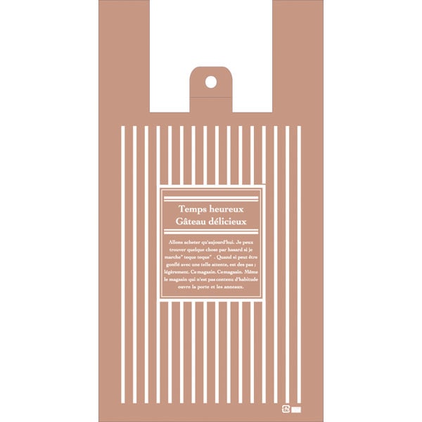 【規格内容】仕上幅240(マチ140)×長さ453mm【厚み】0.013mm【形状】レジ袋【材質】HDPE【補足2】使い捨て【色】透明茶白【柄】柄付【キーワード】買い物袋、買物袋、レジ袋、手提げポリ袋、英字柄、洋菓子店向け、パン屋さん向け、ベーカリー、雑貨店向け、ポリ手提げ袋、ストライプ柄【商品特徴】使いやすいデザインのレジ袋です。