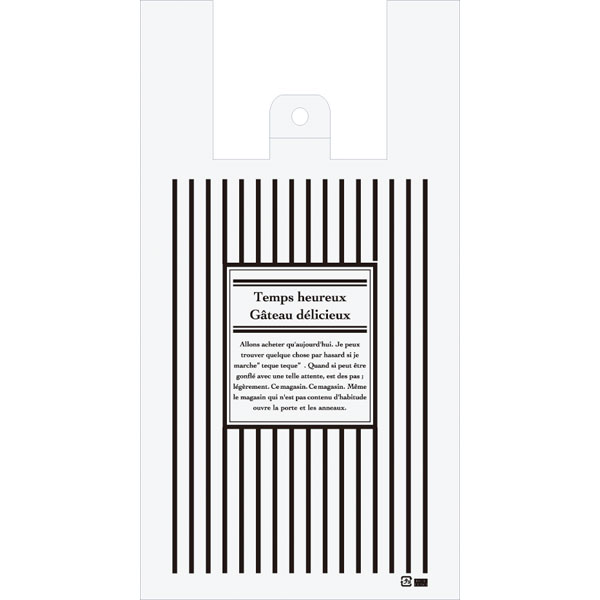 【規格内容】仕上幅240(マチ140)×長さ453mm【厚み】0.013mm【形状】レジ袋【材質】HDPE【補足2】使い捨て【色】透明黒【柄】柄付【キーワード】買い物袋、買物袋、レジ袋、手提げポリ袋、英字柄、洋菓子店向け、パン屋さん向け、ベーカリー、雑貨店向け、ポリ手提げ袋、ストライプ柄【商品特徴】使いやすいデザインのレジ袋です。