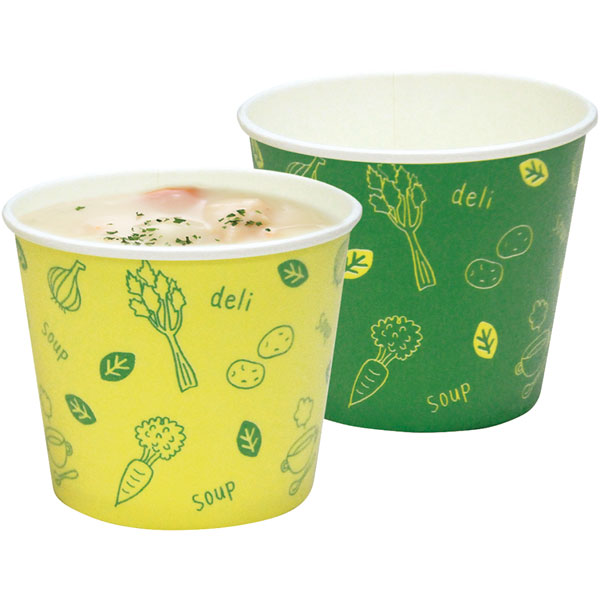 【規格内容】口径Φ98×高さ82.5mm【容量】400ml【販売形態】カップのみ【材質】紙【補足2】使い捨て【色】白緑黄【柄】柄付【イベント・行事】お持ち帰り、学園祭、バザー、お祭り、夏祭り、文化祭、屋台、出店、露店【キーワード】かき氷容器、かき氷カップ、テイクアウト容器、スープカップ、屋台向け、かわいい【商品特徴】表面に特殊発泡ラミネート加工を施した、スープ用の断熱紙カップです。「両面ラミ紙容器PC−395」と同じリッドがご使用いただけます。