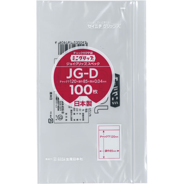 【規格内容】チャック下120×袋幅85mm【厚み】0.04mm【材質】PP(ポリプロピレン)【補足1】国内生産品【補足2】使い捨て【色】透明【柄】柄無【キーワード】ビニール袋、ポリ袋、ポリエチレン袋【商品特徴】透明性抜群のポリプロピレン製のチャック付袋。チャック部分をリニューアル、開口部の段差が広がり、さらに開けやすくなりました!防湿性があり乾燥剤のご使用が可能ですので、繊維製品、日用雑貨品の他、乾燥農産加工食品、乾燥海産加工食品等の包装にもご利用いただけます。汎用性の高いフィルム厚0.04mm、チャック部分カラー着色タイプ。「セイニチグリップス」は、開けやすく閉めやすい、かつ高い密閉性を実現した、チャック付き規格袋シリーズです。タイプも色々取り揃えました。安全で安心な日本製です。