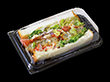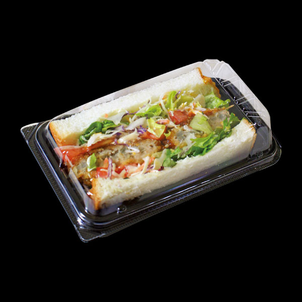 【規格内容】幅99×奥行168×本体の最大高50(蓋セット時のフランジ部を除いた蓋の最小高15)mm【厚み】0.3mm【耐冷耐熱温度】80℃【販売形態】折蓋型【形状】外嵌合蓋【材質】OPS【補足2】使い捨て【色】黒/透明【柄】柄無【キーワード】ランチボックス、サンドイッチケース、テイクアウト容器、フードパック、フタ一体型【商品特徴】立ててディスプレイできるので売り場でのアピール力も抜群、食パン2分の1カットサイズ用のサンドウィッチケースです。斜めカットの蓋でボリュームのあるサンドウィッチでも引っかからずに開閉できます。