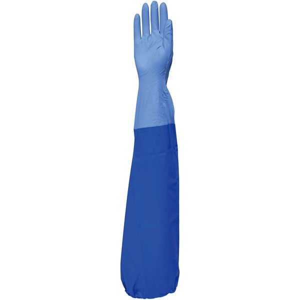 【規格内容】長さ65cm【形状】四角【色】青【材質】本体:ニトリル(合成ゴム)、腕カバー部分:ポリエチレン系樹脂【補足1】食品衛生法適合【補足2】抗菌・防臭仕様【商品特徴】肘の上までしっかりカバー!全長65cmの腕カバー付ロング手袋。安全、耐油、耐久性で欧米では高い評価と歴史を誇る新素材の作業用手袋です。突き刺しや摩耗に強く、安全です。腕カバー部分は、軽量なポリエチレン系樹脂、接合部分は独自技術により強力に接着しています。食品衛生法適合品。
