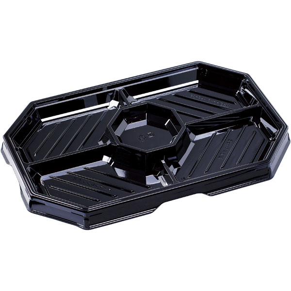 【規格内容】幅428×奥行280×高さ38mm【耐冷耐熱温度】90℃【販売形態】本体のみ【材質】HI【補足2】使い捨て【色】黒【柄】柄無【季節】1月、4月、5月、8月【キーワード】正月、ゴールデンウィーク、GW、お盆、四角、八角型【商品特徴】重厚感のある八角型オードブル容器。重量感あるハカマ形状と足ぐりが高級感を演出、蓋の形状を内落としにすることにより水滴もれを抑制します。蓋の形状を内落としにすることにより水滴もれを抑制します。