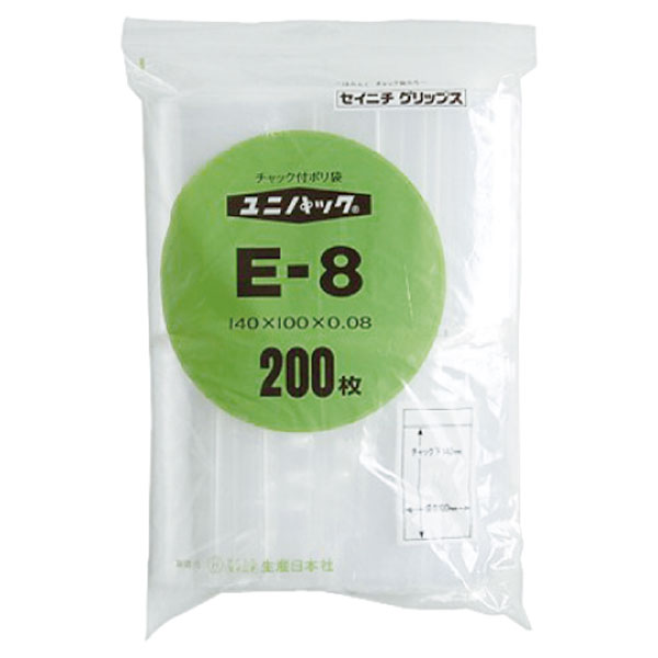 【規格内容】チャック下140×袋幅100mm【厚み】0.08mm【材質】LDPE【補足1】国内生産品【商品特徴】開けやすい・閉めやすい、何度でも開閉自在、チャック付PE袋の定番品。開けやすい開口段差カット採用。文房具、日用雑貨品、食品、医薬品、繊維製品など幅広くご利用いただけます。重量物にも適した0.08mm、厚手タイプ。「セイニチグリップス」は、開けやすく閉めやすい、かつ高い密閉性を実現した、チャック付き規格袋シリーズです。タイプも色々取り揃えました。安全で安心な日本製です。【色】透明【柄】柄無