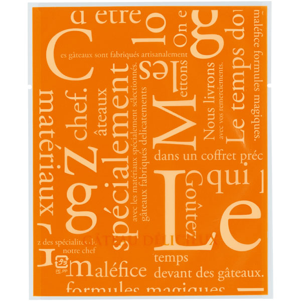【規格内容】幅115×長さ140mm【厚み】0.06mm【形状】カマス袋【材質】KOP20/LLD40【加工】Uノッチ(左右)付、縦5mmシール【補足1】脱酸素剤対応、乾燥剤対応、ノッチ付【補足2】使い捨て【色】透明橙【柄】柄付【キーワード】菓子袋、ガスバリア袋、焼き菓子袋、焼き菓子用袋、ラッピング、パッケージ、個包装用袋、包材【用途】マドレーヌ、クッキー、パウンドケーキ、焼ドーナツ【商品特徴】洋菓子にぴったりな柄を豊富に揃えました。