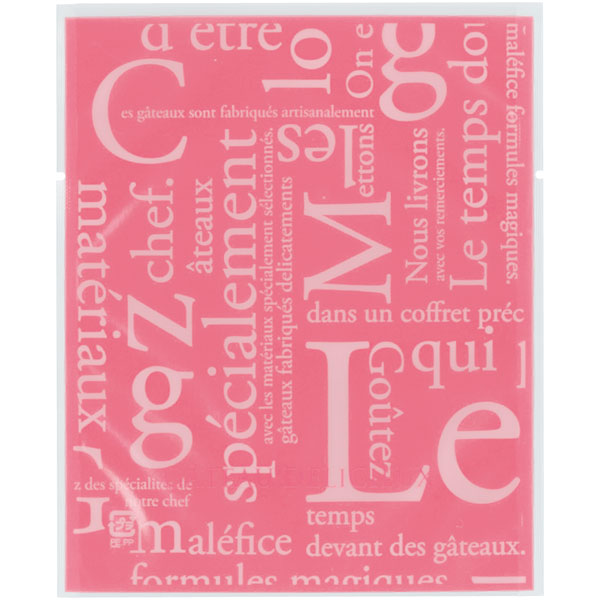 【規格内容】幅115×長さ140mm【厚み】0.06mm【形状】カマス袋【材質】KOP20/LLD40【加工】Uノッチ(左右)付、縦5mmシール【補足1】脱酸素剤対応、乾燥剤対応、ノッチ付【補足2】使い捨て【色】透明桃【柄】柄付【キーワード】菓子袋、ガスバリア袋、焼き菓子袋、焼き菓子用袋、ラッピング、パッケージ、個包装用袋、包材【用途】マドレーヌ、クッキー、パウンドケーキ、焼ドーナツ【商品特徴】洋菓子にぴったりな柄を豊富に揃えました。