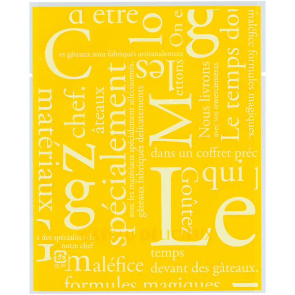 【規格内容】幅130×長さ160mm【厚み】0.06mm【形状】カマス袋【材質】KOP20/LLD40【加工】Uノッチ(左右)付、縦5mmシール【補足1】脱酸素剤対応、乾燥剤対応、ノッチ付【補足2】使い捨て【色】透明黄【柄】柄付【キーワード】菓子袋、ガスバリア袋、焼き菓子袋、焼き菓子用袋、ラッピング、パッケージ、個包装用袋、包材【用途】マドレーヌ、クッキー、パウンドケーキ、焼ドーナツ【商品特徴】洋菓子にぴったりな柄を豊富に揃えました。
