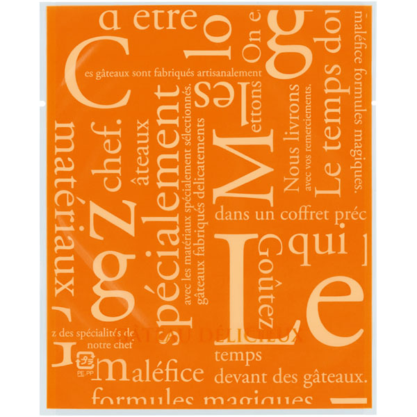 【規格内容】幅130×長さ160mm【厚み】0.06mm【形状】カマス袋【材質】KOP20/LLD40【加工】Uノッチ(左右)付、縦5mmシール【補足1】脱酸素剤対応、乾燥剤対応、ノッチ付【補足2】使い捨て【色】透明橙【柄】柄付【キーワード】菓子袋、ガスバリア袋、焼き菓子袋、焼き菓子用袋、ラッピング、パッケージ、個包装用袋、包材【用途】マドレーヌ、クッキー、パウンドケーキ、焼ドーナツ【商品特徴】洋菓子にぴったりな柄を豊富に揃えました。