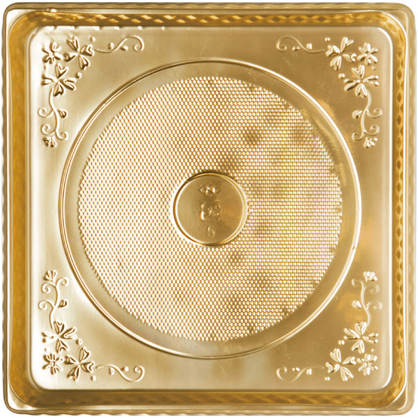 ■【規格内容】幅138×奥行138×高さ12(内円径Φ90)mm【材質】HIPS【商品特徴】デコレーションケーキ用のトレー。【色】金【柄】柄付