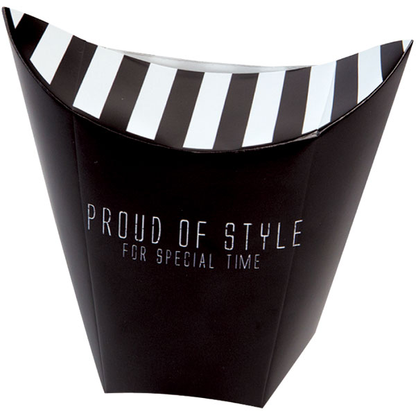 【規格内容】幅112×長さ70(袋部分長さ110)mm【形状】四角【色】黒【材質】NEWピジョン260g【商品特徴】モノトーンデザインが中身を引き立てる、蓋ができるタイプのスナックカートンです。ドリンクホルダーにも入れられます。