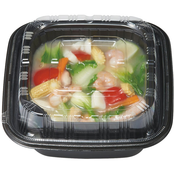 【規格内容】幅192×奥行192×高さ71mm【容量】総容量720g【耐冷耐熱温度】110℃【販売形態】本体のみ【材質】発泡PP【補足1】レンジOK、レンジ対応(本体のみ)【補足2】使い捨て【色】黒【柄】柄無【キーワード】丼ぶり、どんぶり、角丼、軽食、テイクアウト容器、デリバリー容器、ラーメン容器、うどん容器、バラ出し、おしゃれ、業務用、使い捨て食品容器、話題沸騰。中皿付きで汁漏れしにくい、あんかけメニューに最適!たっぷり入る大容量角型タイプ!レンジアップOK!再加熱のキット商品も美味しく提供できます。中皿に具材を盛付けてご飯を入れた本体にセットすればテイクアウト商品完成!本体、ご飯:320g※ご飯・麻婆豆腐の容量は目安です。 ※自転車・バイク配送など強い衝撃が加わりやすい状況では中身が漏れたり飛び出て火傷をする恐れがありますので、商品はラップ等で保護の上、お渡し時や配送中はなるべく衝撃を避けてご提供下さい。