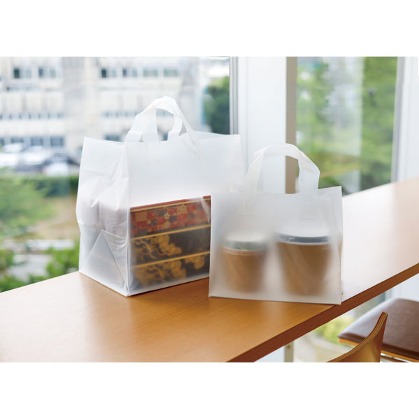 ■【規格内容】幅250×奥行160×高さ280mm【厚み】0.06mm【色】透明【柄】柄無【材質】HDPEナチュラル【商品特徴】高級感のあるマットな半透明素材のポリバッグです。しっかりした厚みに加え、底ボール付きでたわみにくくテイクアウトなどにもおすすめです。・底ボール付