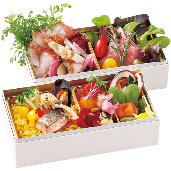 業務用食材 TOP ≫ 消耗品 ≫ 弁当・テイクアウト容器 ≫ 仕切り付き弁当容器 ≫ HSH-W200-105 2段貼箱 白木目 エンボス(内銀)セット 10セット Y019060