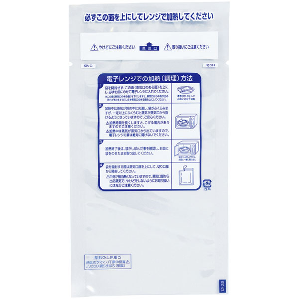 【規格内容】幅120×長さ220mm【形状】レンジシールスタンド【厚み】0.075mm【耐冷耐熱温度】−40℃~95℃【色】透明【柄】柄無【材質】ONY15/LLD60※NO.13−17のみ(材質…ONY15/LLD50)になります。【補足1】真空袋_Vノッチ有、真空袋_三方袋、レンジOK【商品特徴】未開封のまま電子レンジで温めができる蒸気抜き機能付きのラミネート袋です。液体から固形まで幅広くご使用いただけます。・未開封のまま電子レンジで温めが可能です。・解凍が容易で、かつ短時間で調理できます。・加熱調理中は内圧が一定に保たれ、食材の均一化がはかられます。・煮汁のある惣菜でも対応可能です。・イージーピール材を使用していないため、内外圧に対しても強く、物流時も安心です。・95℃30分ボイル殺菌が可能です。・Vノッチ付きで開封が便利です。・お使いいただき易いように説明文を印刷しています。用途:ハンバーグ、ミートボール、酢豚、豚の生姜焼き、照り焼きチキン、煮魚、昆布豆等※底から中身を入れた後にヒートシール(熱による接着)するタイプになります。 ※内容物によってレンジアップ時にフィルムが焦げたり破袋する問題があります。十分にレンジアップテストを行ってご使用ください。※レンジアップ時、蒸気口から『ピー』という音がなる場合がありますが、品質上問題はありません。※含気・ガス置換での御使用を想定して設計しておりません。真空包装のみでご使用ください。