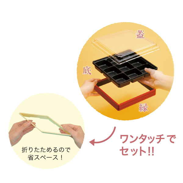 ■【規格内容】幅157×奥行109×高さ26mm【色】金【柄】柄無【販売形態】中皿のみ【材質】PA【商品特徴】お客様の満足感と内容量の最適化を両立させた感覚に訴求する新たな折箱です。 ※縁・底・蓋それぞれパーツ別での納品となります。