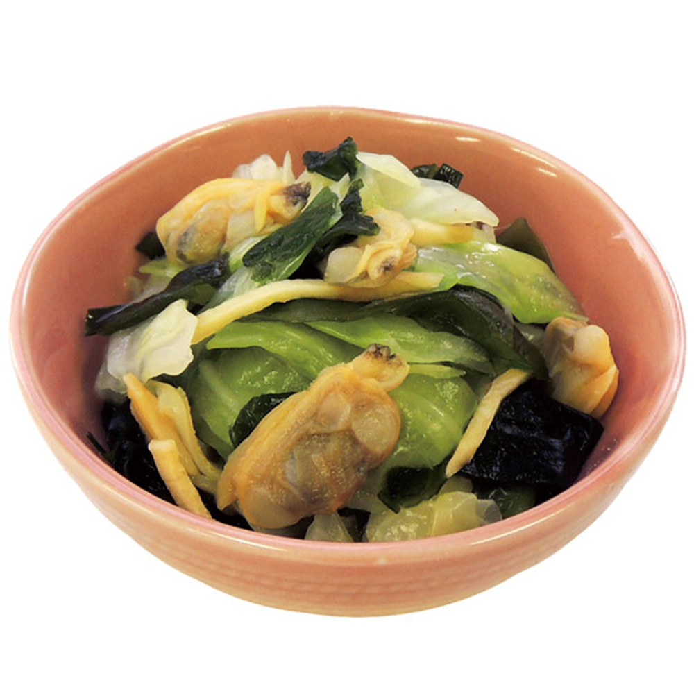 国産キャベツのシャキッと食感。あさりの旨味とわかめを加えた酒蒸し風の味付け。刻み生姜の食感と爽やかな風味。