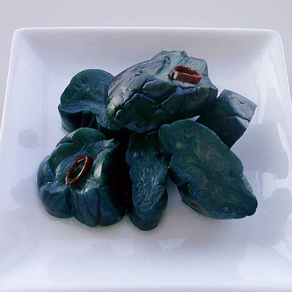 ■原材料:なす(中国)、漬け原材料〔食塩、アミノ酸液、果糖ぶどう糖液糖、しょうゆ、醸造酢、焼酎、かつおぶしエキス、発酵調味料、とうがらし〕/調味料(アミノ酸等)、酸味料、酒精、保存料(ソルビン酸K)、甘味料(ステビア、甘草)、着色料(青1)、(一部に小麦・大豆を含む)